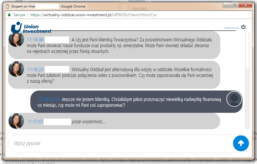 Za pomocą Wirtualnego Oddziału otrzymałam poradę, w jaki najlepszy dla mnie sposób, mogę zainwestować niewielkie kwoty. Tego dotyczył mój test. Na bieżąco miałam też podsyłane linki, z którymi mogłam się w międzyczasie dokładniej zapoznać i rozwiać swoje wszelkie ewentualne wątpliwości. Wirtualny Oddział to zdecydowanie dobre wyjście dla takich analizatorów jak ja. Dane doradcy celowo usunęłam, gdyż pracownik nie miał świadomości, że właśnie bierze udział w moim teście 😉